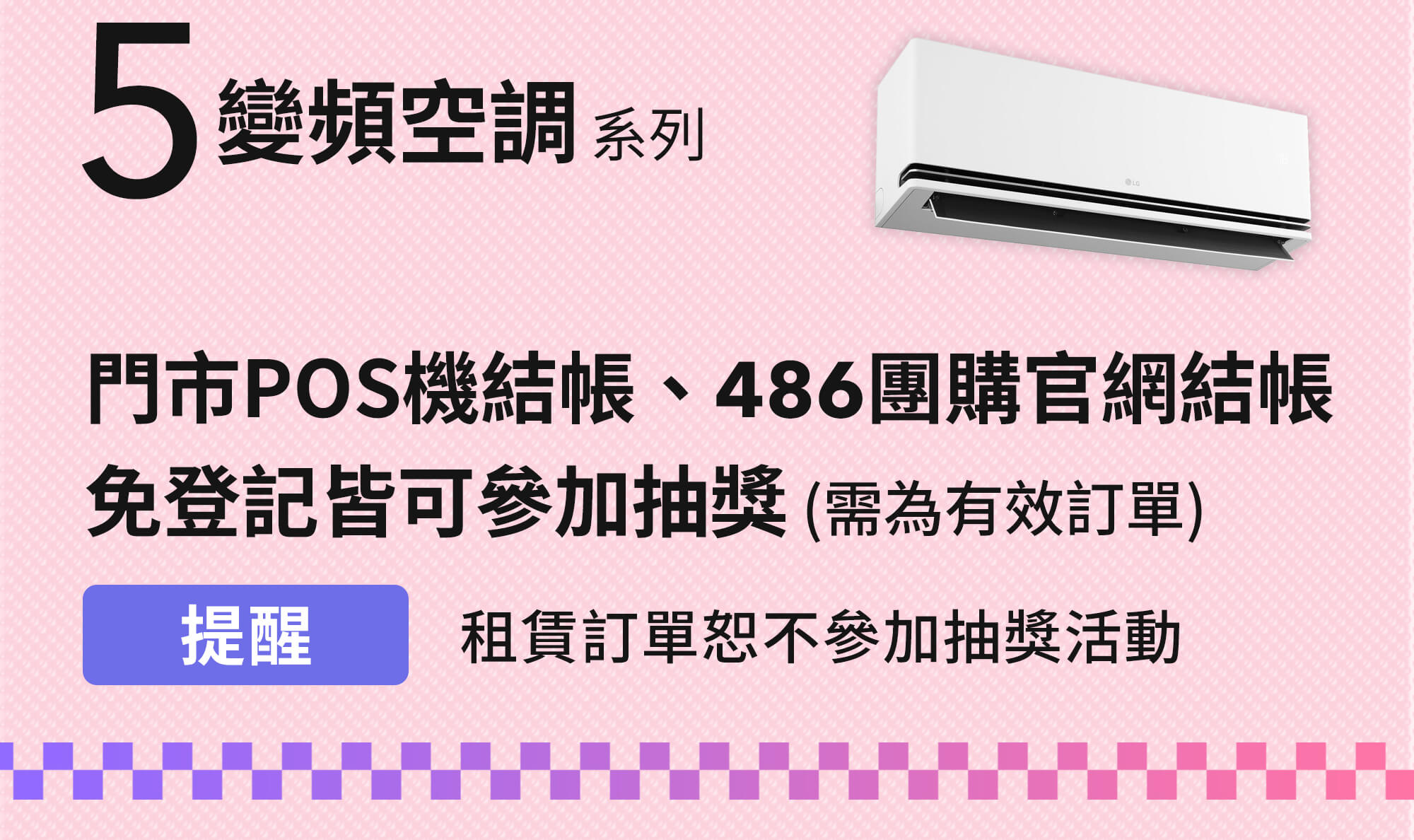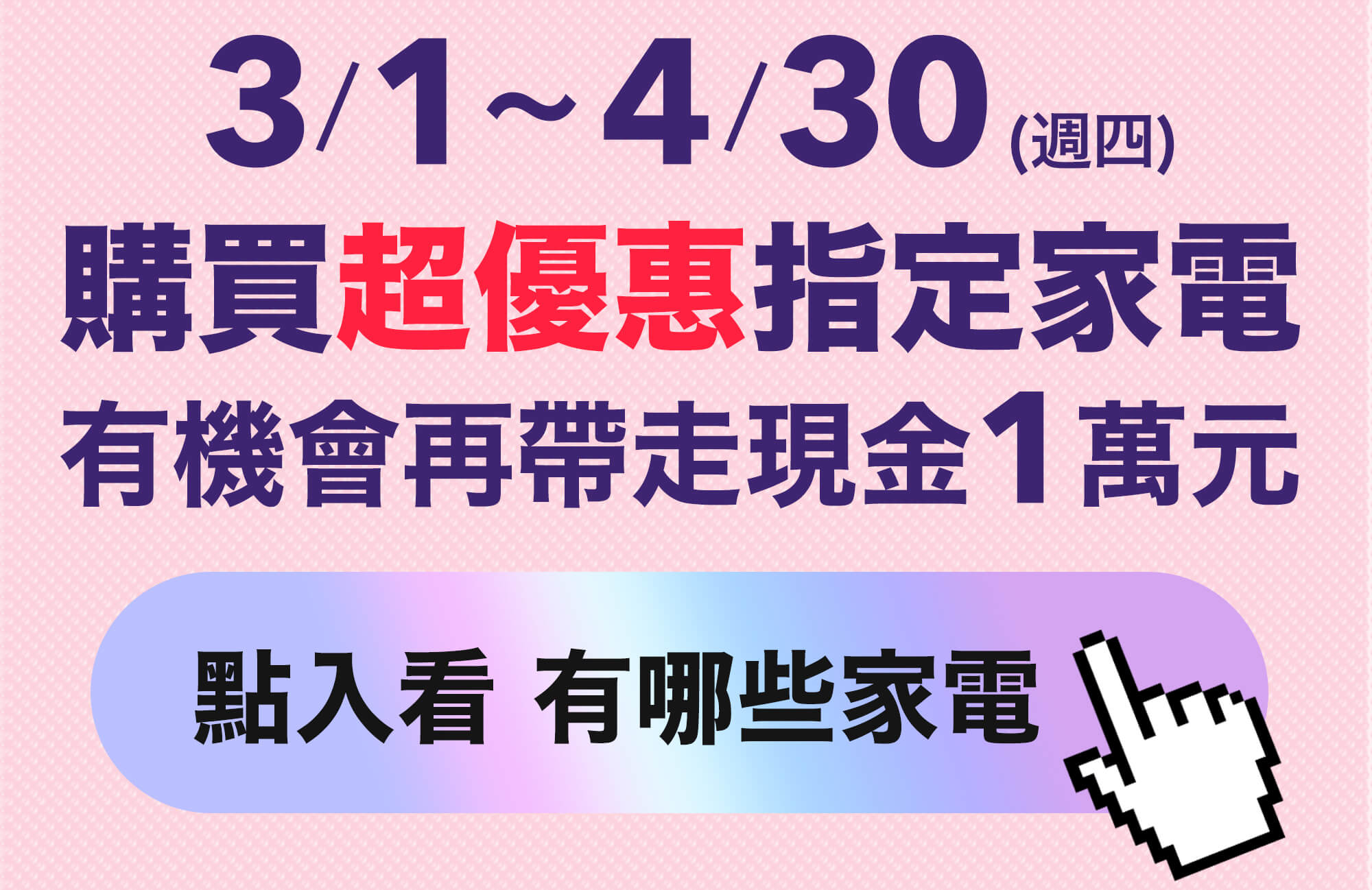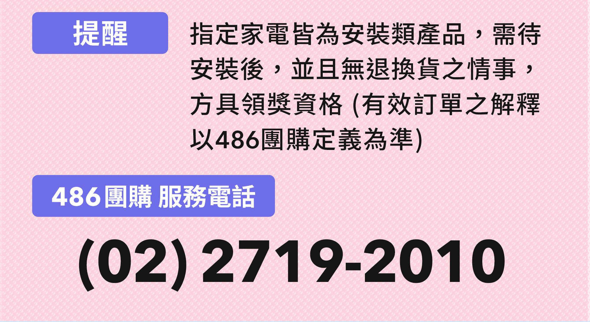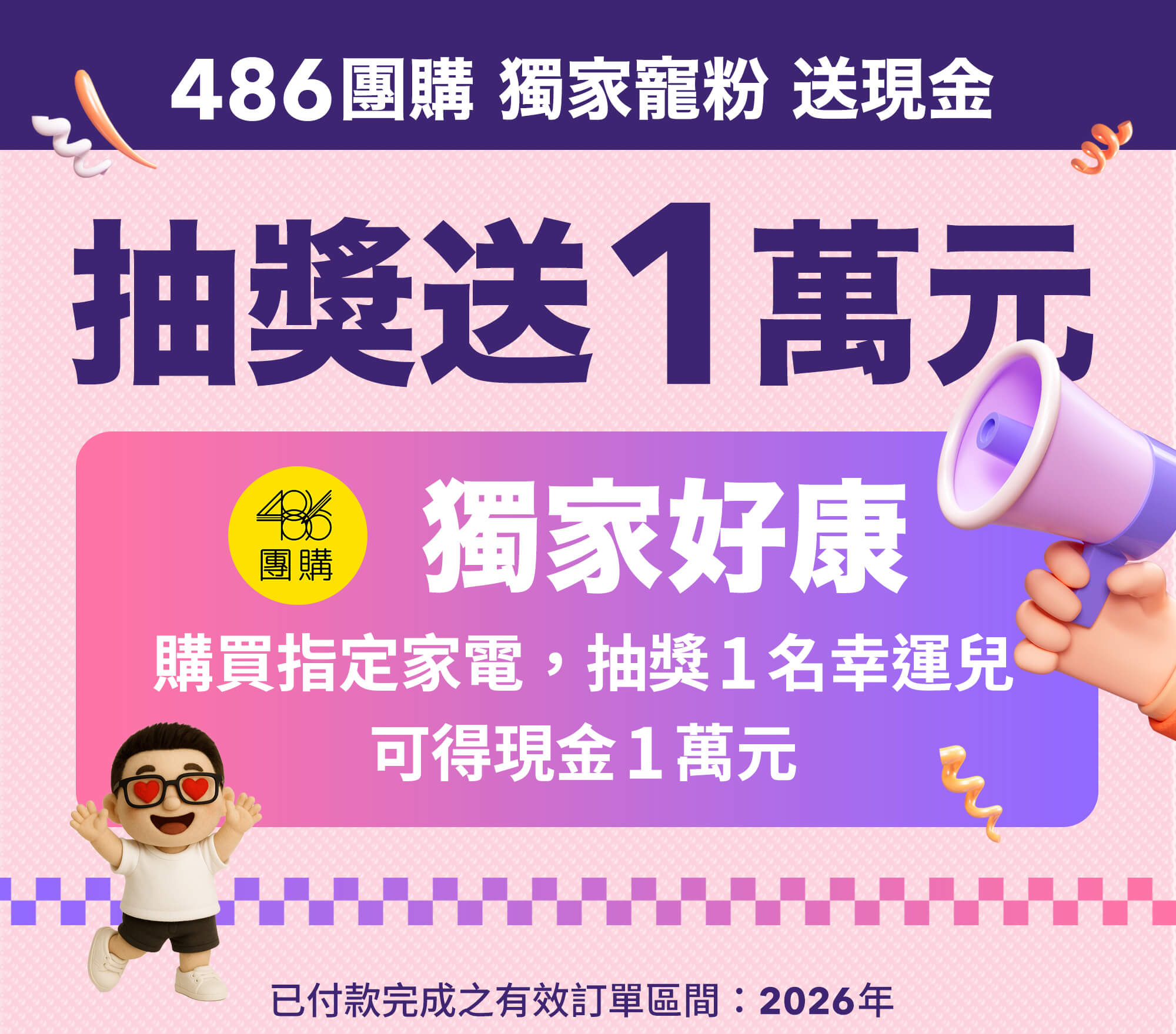 - 2026/3/1-2026/4/30 活動期間於486團購官網/486實體門市購買指定家電,且於活動期間內付款完成,免登記抽現金1萬元,活動共計1名中獎者 (總獎金1萬元),租賃訂單不參與此次活動