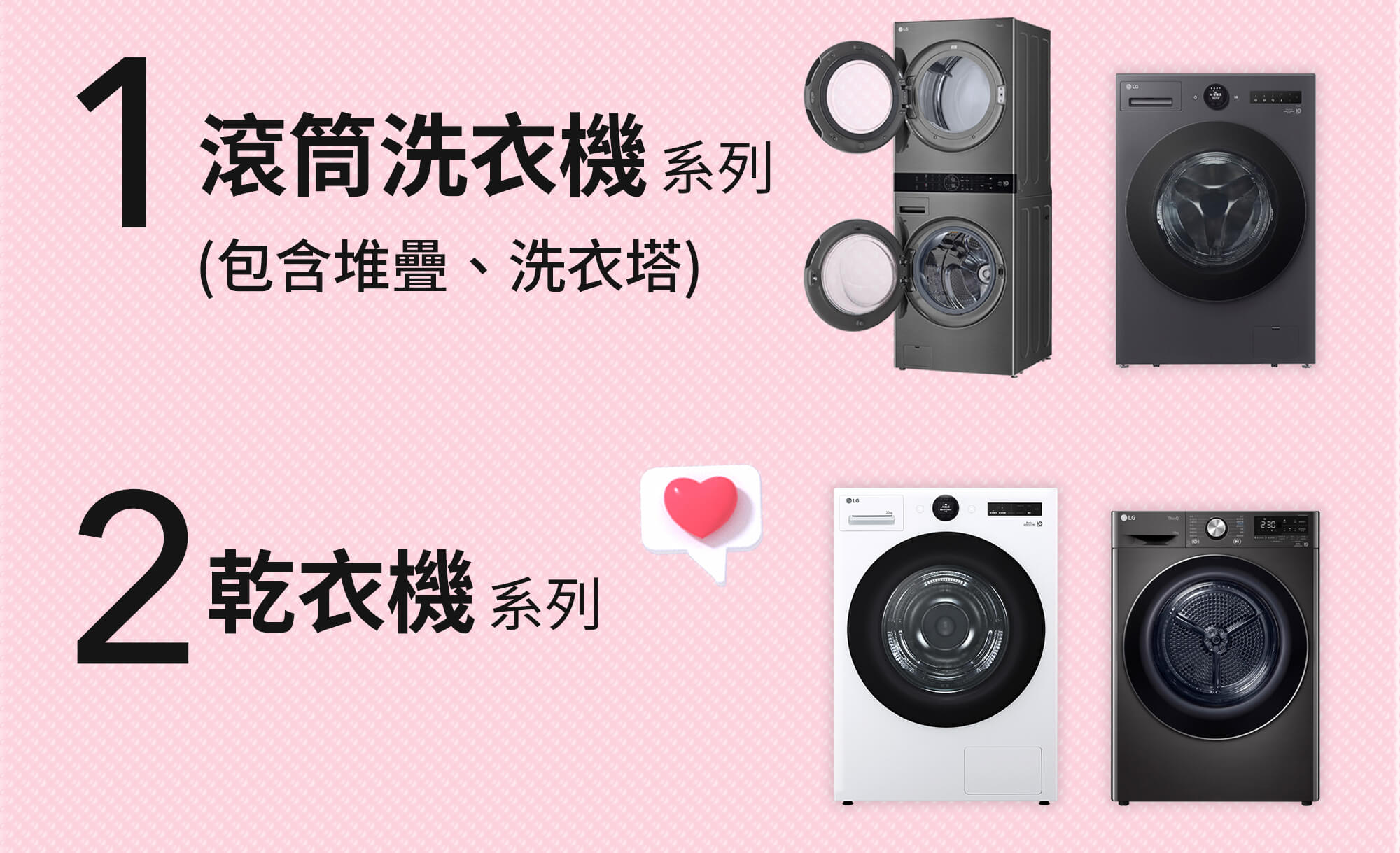 - (1)滾筒系列,包含堆疊、洗衣塔WashTower™
