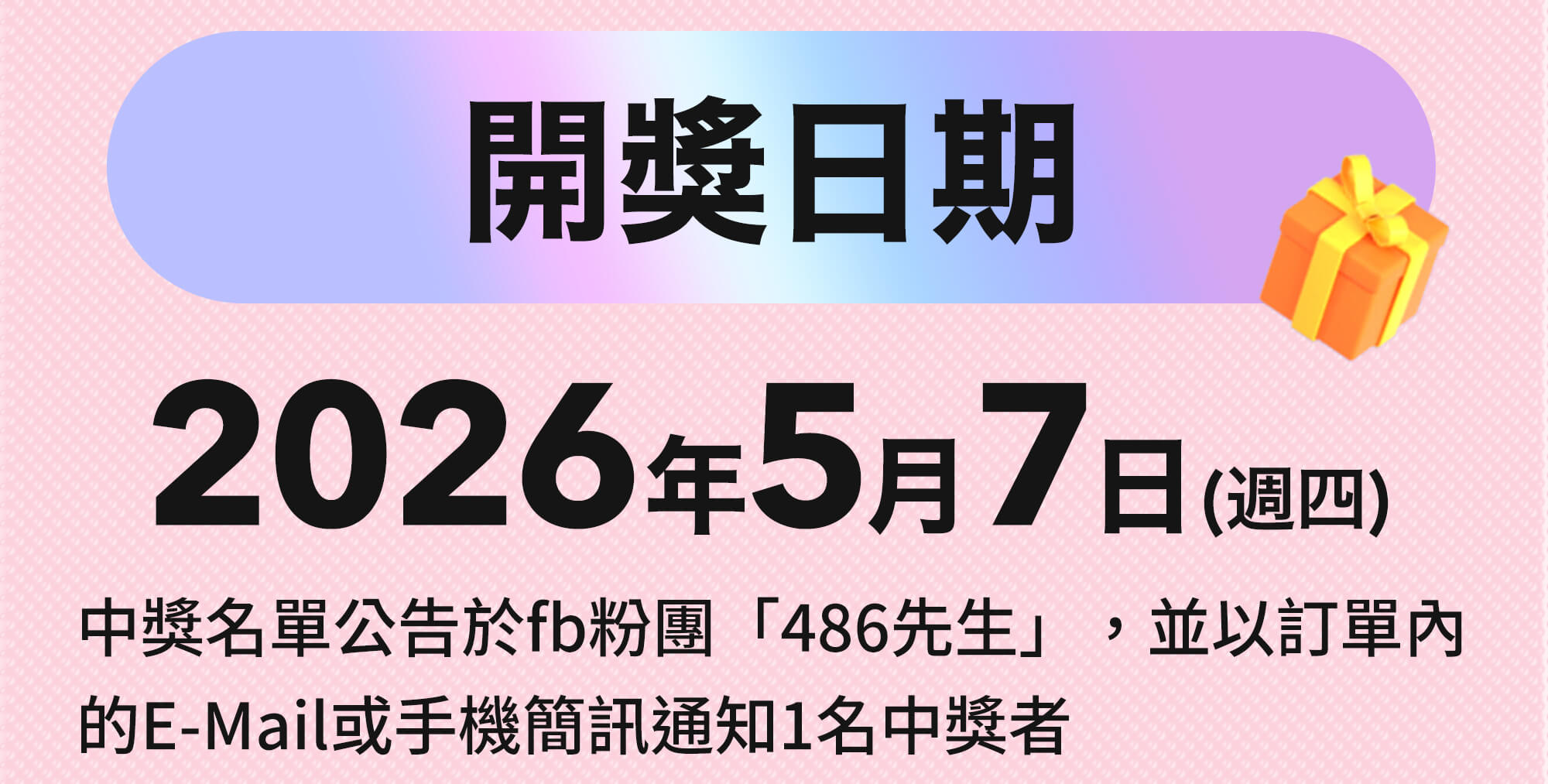 - 中獎者以fb粉團「486先生」或本活動頁公告為主,並於2026/5/7前 以E-Mail或手機簡訊通知中獎者,中獎者須於2026/5/12前完成預繳機會中獎稅款及回覆中獎通知始完成領獎,逾期視同放棄領獎權益。活動得獎者如沒有收到信件,請於2026/5/8前主動E-mail至sherry@486shop.com或致電486團購(02)2719-2010,並提供中獎姓名、電話等,以供486團購查驗得獎資格;以上以E-Mail寄送時間或手機簡訊時間為憑,逾時得取消資格